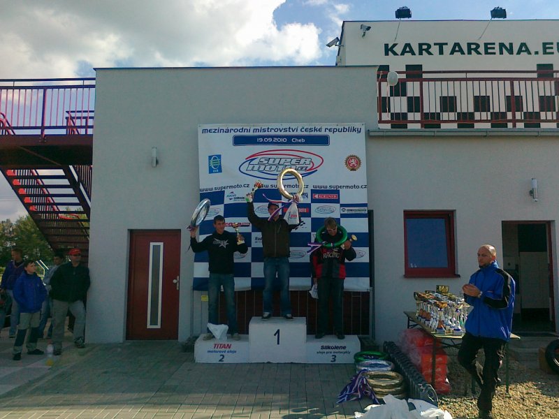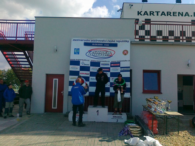 Z posledních závodů v Chebu si Kejmi přivezl jedno druhé místo a pěknej votok-viz foto,není to koleno,ale loket (-:Bohužel hůře skončil Kája Staněk,těsně před rozhovorem do České televize zavrávoral na téže lavici a večer šel v Motole na operaci,2 kila pomerančů mám už doma tak snad zítra po narkoze už zapne telefon. Závody myslím povedené a je zázrak,že tam bylo pár diváků,bez žádné reklamy na závod.Zatím jen pár fotek z vyhlášení,celkové výsledky později.
